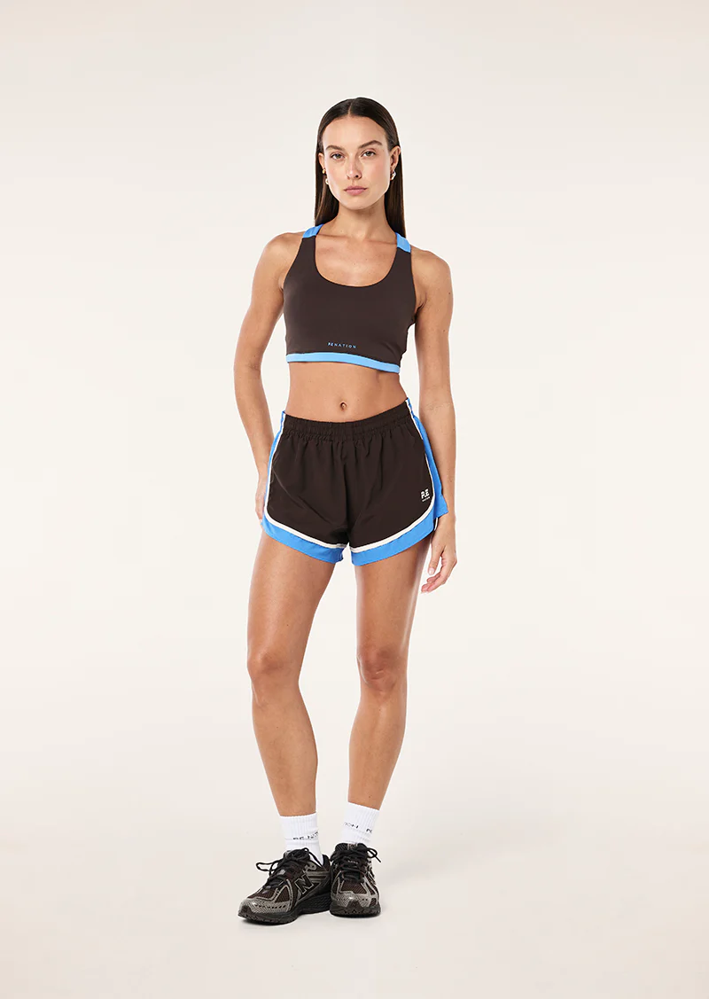 The Stride Short in Coffee & Marina Blue is crafted from a lightweight four-way stretch fabrication designed to enhance mobility and comfort during training. Ideal for running, gym sessions and active days, it offers breathable performance with functional design. Featuring contrast ripstop panels, functional pockets and a drawcord waistband, it delivers a comfortable and adaptable fit. Pair it with the Highgate Sports Bra versatile training outfit.